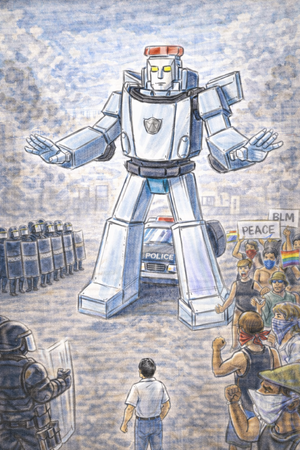 A pacifist at heart, Alert would rather be drawing the battle plan than actually be on the battlefield. Strives to find reason in everything, to the point of the annoyance of others. Very quiet as compared to his brother Slide he is known to compose extremely detailed and documented plans for Botimus Prime. A bit bipolar, his mood can change from energetic, to depressed almost instantly. During the 2020 summer riots, he did what he could to bring peace to several cities.